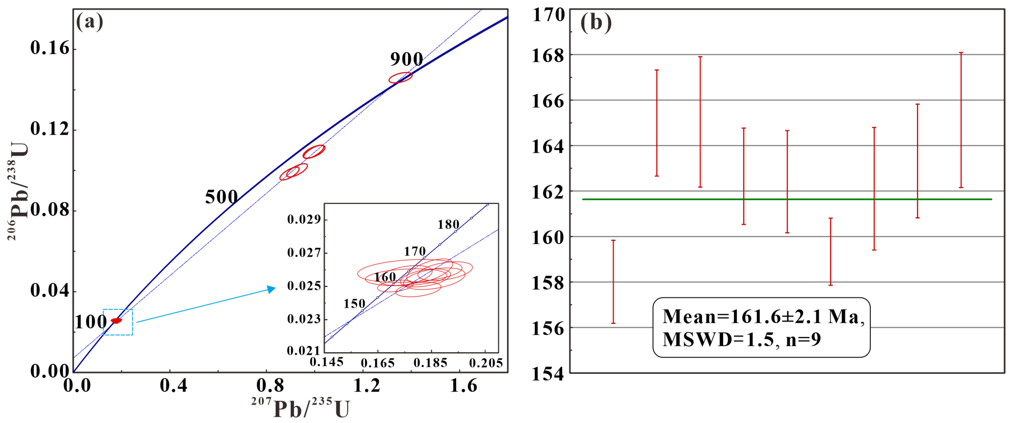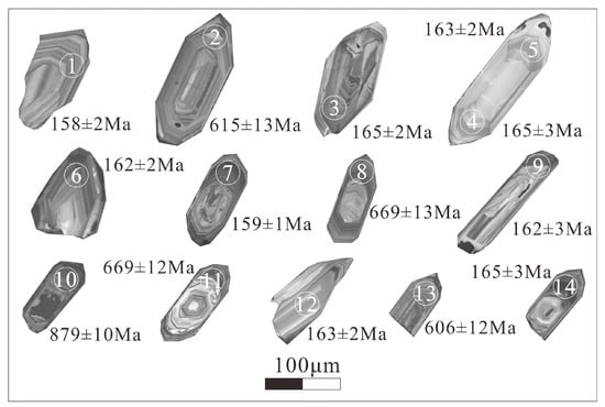 All 14 analytical spots yielded concordant or near-concordant U-Pb ages, plotting cohesively on the Tera–Wasserburg concordia diagram (Figure 5). Nine relatively concentrated isotopic ages provided a weighted mean 206Pb/238U age of 161.6 ± 2.1 Ma (MSWD = 1.5, n = 9). This age was interpreted as the crystallization age of the biotite granite porphyry. The other measurement points were relatively scattered, ranging from 606 to 879 Ma, which may indicate the age of captured Neoproterozoic zircons (e.g., ~847 Ma [51]).