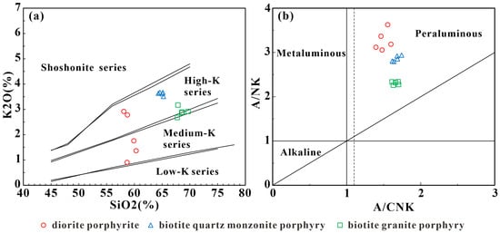 Petrological diagrams of the adakitic rocks in the Zhuxi district: (a) Relationships between K2O and SiO2 (the base map is from [53]). (b) A/NK vs. A/CNK diagram (the base map is from [54]).