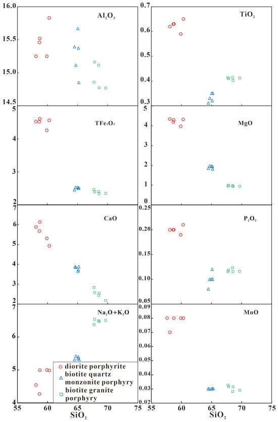 Whole-rock major element compositions for the newly analyzed biotite granite porphyry (ZK2105 samples) and previously published data for diorite porphyrite (ZX15-01-06 [42]) and biotite quartz monzonite porphyry (ZL-YQ11-15 [52]) are listed in Table 2. The three rock types show increasing SiO2 contents, corresponding to increasing acidity, from the diorite porphyrite (avg. 59.13 wt%) to the biotite quartz monzonite porphyry (avg. 64.91 wt%) to the biotite granite porphyry (avg. 68.46 wt%). The TiO2 content is highest in the diorite porphyrite (avg. 0.62 wt%), lowest in the biotite quartz monzonite porphyry (avg. 0.33 wt%), and intermediate in the biotite granite porphyry (avg. 0.41 wt%). The Al2O3 contents are relatively high and comparable across the three types (avg. 15.46 wt%, 15.28 wt%, and 14.94 wt%, respectively). With increasing SiO2, the MgO (avg. 4.22, 1.90, and 0.96 wt%) and TFe2O3 (total iron as Fe2O3; avg. 4.49, 2.50, and 2.38 wt%) contents decrease, while the total alkali content (Na2O + K2O; avg. 4.76, 5.35, and 6.48 wt%) increases. Notably, the biotite quartz monzonite porphyry exhibits a significantly higher K2O content compared to the other two rock types at similar SiO2 levels.