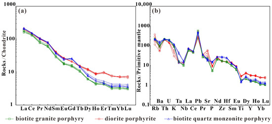 Rare-earth element (REE) and trace element data for the three rock types are presented in Table 2. Chondrite-normalized REE patterns (Figure 8a) are characterized by enrichment in light REEs (LREEs) relative to heavy REEs (HREEs), resulting in moderately to steeply right-dipping patterns. The LREE segments are steeper than the relatively flat HREE segments. The total REE contents (ΣREEs) are similar for the diorite porphyrite (avg. 202.8 ppm) and the biotite quartz monzonite porphyry (avg. 208.8 ppm) but lower in the more evolved biotite granite porphyry (avg. 173.0 ppm). The ΣREEs contents follow the same trend (avg. 191.2, 199.0, and 166.2 ppm, respectively). The ΣREEs contents decrease systematically with increasing SiO2, from the diorite porphyrite (avg. 11.6 ppm) through the biotite quartz monzonite porphyry (avg. 9.8 ppm) to the biotite granite porphyry (avg. 6.8 ppm). Consequently, the degree of LREE/HREE fractionation, indicated by ratios such as (La/Yb)N, increases with differentiation (the average (La/Yb)N values are approximately 16.5, 20.4, and 24.4 for the three rock types, respectively). All samples exhibit slight negative Eu anomalies, with δEu (Eu/Eu*) values ranging from 0.83 to 0.90 for the diorite porphyrite, from 0.74 to 0.81 for the biotite quartz monzonite porphyry, and from 0.77 to 0.81 for the biotite granite porphyry.