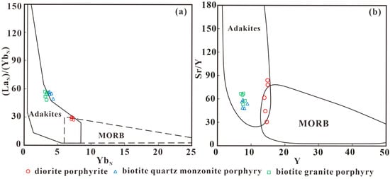 Discrimination diagram of the adakitic rocks in the Zhuxi district: (a) (LaN)/(YbN) vs. YbN diagram; (b) (Sr/Y) vs. Y diagram (the base map is from [56]).