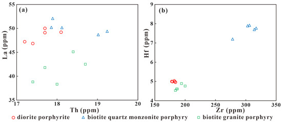 Correlation diagrams for pairs of geochemically coherent, relatively immobile elements, such as Th vs. La and Zr vs. Hf (Figure 10), show strong positive linear correlations for samples from all three intrusive suites. This coherence suggests that these elements, and likely other HFSEs and REEs, largely preserved their primary magmatic ratios and were not significantly mobilized or fractionated relative to each other by the observed alteration. Furthermore, the overall consistency and systematic variations observed in the chondrite-normalized REE patterns (Figure 8a) and primitive mantle-normalized trace element patterns (Figure 8b), particularly for the HFSEs, lend further support to their relative immobility and utility in reflecting primary magma characteristics [57].