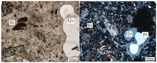 Rounded quartz in the biotite quartz monzonite porphyry (Bt—biotite; Pl—plagioclase; Qz—quartz) (revised from [52]).