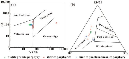 Tectonic discrimination diagram of the adakitic rocks in the Zhuxi district: (a) Rb vs. (Y + Nb) tectonic discrimination diagram (the base map is from [73]); (b) Rb-Hf-Ta tectonic discrimination diagram (the base map is from [74]).