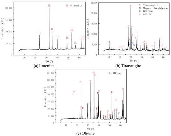 The ilmenite (FeTiO3) sample for this test was taken from olivine-type vanadium titanomagnetite in the Hongge mining area, which appeared as black gray blocks. The titanaugite samples (Ca (Mg, Fe2+, Fe3+, Al, Ti) [(Si, Al)2O6]]) were taken from gabbro-style vanadium titanomagnetite at the Midi Mineral Processing Plant and were black and massive. The samples of olivine ((Mg, Fe)2 [SiO4]) were taken from coarse-grained peridotite in a certain area of Sichuan, which were green granular. Ilmenite, titanopyroxene, and olivine were crushed and manually sorted repeatedly, and each mineral was repeatedly purified via magnetic separation and gravity separation. Each sample was ground separately using a three-head agate grinder and washed with deionized water to remove surface impurities. A −19 μm experimental sieve was used for wet sieving in deionized water to obtain a pure mineral sample with a full particle size of −19 μm. The obtained sample was sonicated and cleaned three times in deionized water and then dried in a low-temperature (30 °C) vacuum environment. Each mineral sample was stored separately in a clean ground bottle for later use. The XRD analysis results of the pure mineral samples are shown in Figure 1. The theoretical TiO2 content in ilmenite is 52.7%, indicating a purity of 96.09% for the ilmenite sample. Additionally, the theoretical (Fe+Mg)O content in olivine is 57.2%, indicating a purity of 93.96% for the olivine sample.