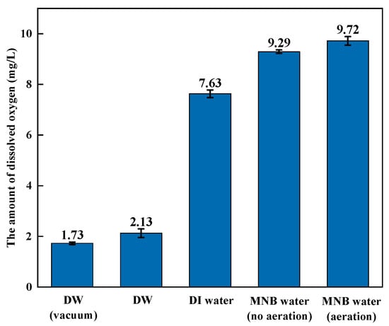 The amount of dissolved gas in water, to some extent, determines the ability to generate bubbles. Our experiment investigated the degree of bubble formation in different waters by testing dissolved oxygen in water. The probe of the dissolved oxygen meter was inserted into freshly prepared deionized water (DI water), degassed water (DW), vacuum-treated degassed water, nonaerated micro–nanobubble water (MNB water), and aerated micro–nanobubble water. Then, seven sets of oxygen content values were measured for the first 15 s of the five water samples, the average value was taken, and the experiment was repeated three times. The experimental results are shown in Figure 2.