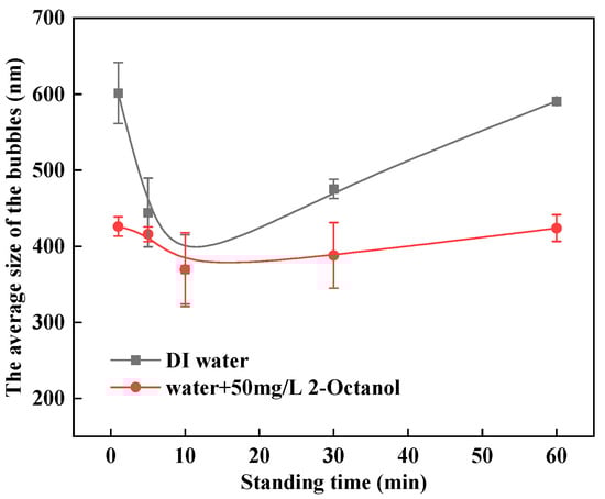 The stability of micro–nanobubbles is an important indicator affecting the efficiency of flotation operations. Based on the measured changes in micro–nanobubbles with standing time, the stability differences in micro–nanobubbles generated in pure water and aqueous solutions containing 50 mg/L of 2-octanol were analyzed, as shown in Figure 3.