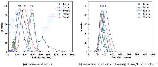 Figure 4a shows the size distribution of micro- and nanobubbles in pure water. The size distribution of micro- and nanobubbles is wider when left standing for 1 min. With a longer standing time, due to the rupture of larger bubbles in water, the size distribution of micro- and nanobubbles shifts to the left. After standing for 30 min, due to the merging or rupture of smaller bubbles in the water, the size distribution of bubbles shifts to the right. Figure 4b shows the size distribution of micro–nanobubbles in a solution containing 50 mg/L of 2-octanol. The bubble size shows a pattern of first decreasing and then increasing with a prolongation of standing time. However, compared with the size distribution in pure water, the addition of 2-octanol results in a smaller change in bubble size. On the other hand, after standing for 1 h, DLS can still detect nanoscale bubbles, and the bubble size in the presence of 2-octanol in water is smaller than that in pure water, indicating once again that micro–nanobubbles have strong stability in 2-octanol solutions. Research indicates that the presence of 2-octanol may extend the time of merging between bubbles, improve the stability of bubble liquid films, and make bubbles less prone to rupture.