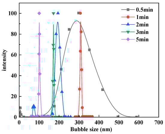The cycle processing time directly affects the shear degree of bubbles. This experiment studied the effect of cycle processing time on the size of micro–nanobubbles by controlling the pump operation time. The size distribution and average size are shown in Figure 7 and Figure 8, respectively.