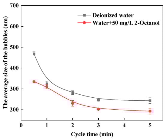 As can be seen from the results in Figure 7 and Figure 8, the cycle processing time significantly affects the size of micro- and nanobubbles. With the increase in cycle processing time, the average size of micro- and nanobubbles decreases, and the size distribution curve shifts to the left. After adding 50 mg/L of 2-octanol, the generated bubbles are all at the nanoscale, and the size of the bubbles is smaller and narrower. At the beginning of the cycle, due to the intense liquid flow, the size of micro- and nanobubbles generated in the solution is larger. As the cycle processing time becomes prolonged, the liquid flow gradually stabilizes, and the larger bubbles continuously shear into smaller bubbles. At this time, the size of micro- and nanobubbles in the solution becomes smaller and smaller. This further proves that the addition of 2-octanol is conducive to the stability of micro–nanobubbles, and smaller bubbles are generated.