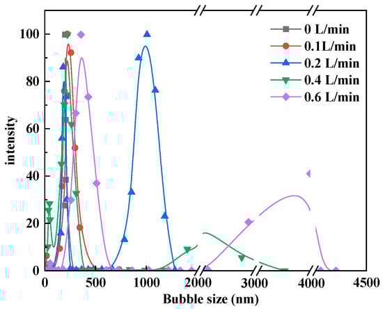 The influence of gas nucleus quantity on the average size and size distribution of micro–nanobubbles was studied by adjusting the inflation rate. The detection results are shown in Figure 9 and Figure 10, respectively.