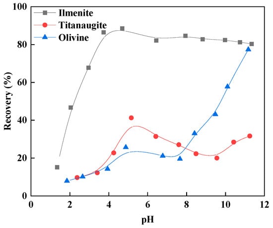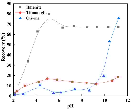 Figure 13. The variation in flotation recovery rates of fine-grained ilmenite, titanaugite, and olivine under the action of sodium silicate with pH value.