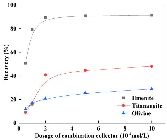 Figure 12. The variation in the flotation recovery rates of fine-grained ilmenite, titanaugite, and olivine with the dosage of combined collectors.