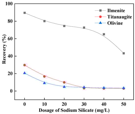 Figure 14. The variation in flotation recovery rates of fine-grained ilmenite, titanaugite, and olivine with sodium silicate dosage.