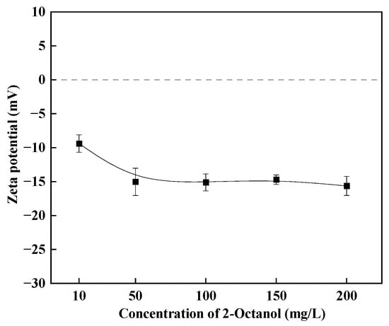 Figure 16. The variation in the zeta potential of micro–nanobubbles with the concentration of 2-octanol.