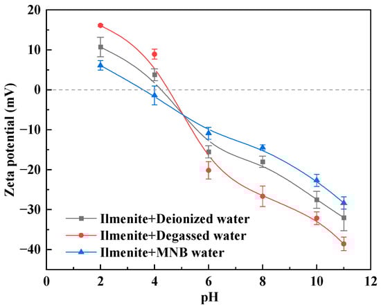 Figure 17. The zeta potential of ilmenite in deionized water, degassed water, and micro–nanobubble water varies with pH.
