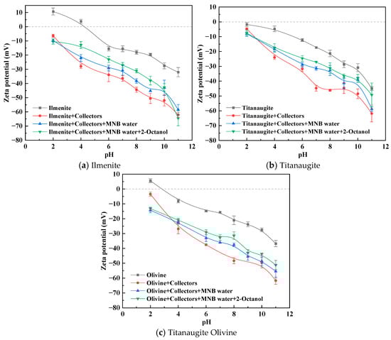 Figure 18. Changes in the zeta potential of fine-grained ilmenite, titanaugite, and olivine with pH under different treatment conditions.