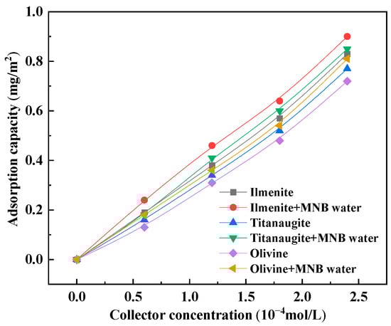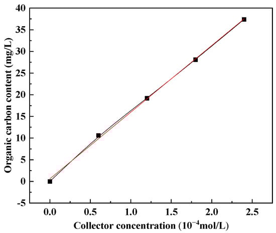 Figure 19 illustrates the standard total organic carbon curve for the combined collector. Figure 20 illustrates the effect of micro–nanobubbles on the adsorption behavior of collectors on ilmenite, titanaugite, and olivine surfaces. The experimental results show that the micro–nanobubbles can significantly enhance the adsorption capacity of these anion combination collectors on the mineral surface. This strengthening effect is mainly due to the fact that the preferential adsorption of collector molecules on the surface of micro–nanobubbles accelerates the diffusion rate of the agent toward the mineral surface. The ultra-high specific surface area and hydrophobic characteristics of micro–nanobubbles provide abundant active sites for agent adsorption.