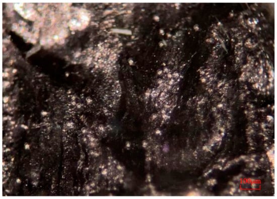 In order to further investigate the effect of micro–nanobubbles on the hydrophobicity of ilmenite particles, the adhesion behavior of bubbles on the surface of ilmenite was observed using a stereo fluorescence microscope. Micro–nanobubble water droplets were added onto a highly hydrophobic ilmenite with a width of 5 mm and placed under a stereomicroscope. A large number of micrometer-sized bubbles were observed to adhere to the surface of ilmenite particles, as shown in Figure 21.