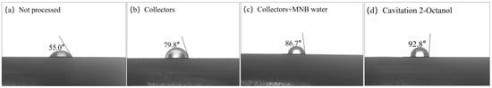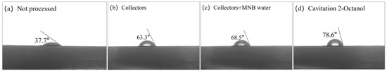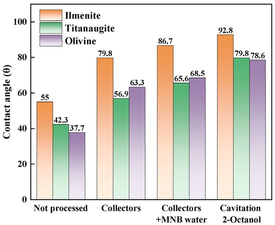 Figure 22 shows the variation in macroscopic contact angles of ilmenite, titanaugite, and olivine under different treatments. When collectors are not present, the contact angles of the three mineral surfaces are small and there is relatively weak hydrophobicity, which corresponds with the results of several studies [44]. In the presence of the collector solution, the surface wettability of the three minerals changed significantly, and the contact angle increased significantly, which confirmed that the effective adsorption of anionic combined collector molecules on the surface of the minerals significantly improved their surface hydrophobicity. It is worth noting that when the molecules are adsorbed on the three minerals through micro–nanobubbles, the contact angle is larger than that of the direct introduction of sodium oleate; that is, the micro–nanobubbles improve the hydrophobicity of ilmenite. This shows that when no small bubbles are present, the water droplets that contact the ilmenite surface only produce a small contact angle. After the introduction of micro–nanobubbles, the connection between the water droplets and the solid is achieved via the combination of the bubbles and the solid. At this time, the contact angle becomes larger. The adhesion energy between the bubble and the hydrophobic surface is higher than the cohesive strength of the bubble itself. At the same time, the adsorption of micro–nanobubbles leads to the participation of more agents in the hydrophobicity of mineral surfaces, and the effect is better under cavitation 2-octanol treatment.