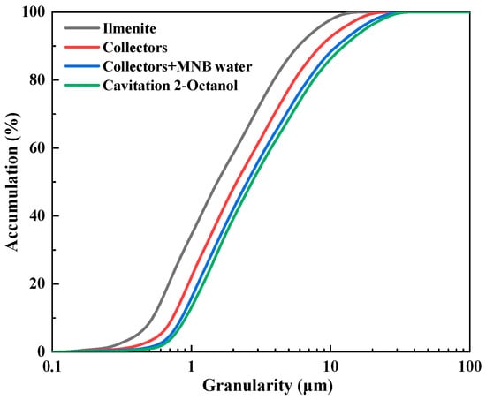 Figure 26. Effect of micro–nanobubbles on the size distribution of fine-grained ilmenite under different treatments (collector concentration: 1.2 × 10−4 mol/L).