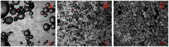As can be seen from Figure 27 and Figure 28, the size of the bubbles in the micro–nanobubble water is smaller, and the number of micro–nanobubbles is larger, but with an increase in observation time, the adjacent micro–nanobubbles merged, and the bubble size gradually increased. The bubble size in the micro–nanobubble water in the 2-octanol environment became significantly smaller, and with an increase in observation time, bubbles still merged, but the bubble size after merging was significantly smaller, and the number of bubbles decreased. As can be seen from Figure 29, the agglomeration of fine ilmenite particles observed with different treatments under the same concentration of the collector is quite different. As seen in Figure 29A, the bubbles in the slurry are large and the number of bubbles is very small only in the environment with deionized water, and although the adhesion of ilmenite on the surface of the bubbles can be observed by adding a collector, still a large number of ilmenite particles remain in the suspension, and agglomeration is not obvious. Figure 29B shows that bubble size decreases significantly, the number of micro–nanobubbles increases, and ilmenite particles agglomerate, indicating that micro–nanobubbles play a “bridging” role in promoting collision and adhesion between fine-grained particles. Figure 29C shows that a further increase in the number of bubbles in the cavitated 2-octanol solution, and mineral particle agglomeration becomes more pronounced. This indicates that the addition of 2-octanol during cavitation can enhance the stability of micro–nanobubbles, making them less prone to merging and rupture, and is beneficial for improving the agglomeration effect of fine titanium iron ore particles. The underlying mechanism of the agglomeration of ilmenite particles is the heterogeneous nucleation of nanobubbles on hydrophobic surfaces. Qiao B showed that the work of adhesion between hydrophobic particles and water is always lower than the work of cohesion of water, which means that the molecular bonding on the interface of hydrophobic particles and water is more easily broken, consequently forming nanobubble nuclei. When particles collide, surface micro–nanobubbles on the contact surface forms bridging capillary forces and induces particle agglomeration [45].