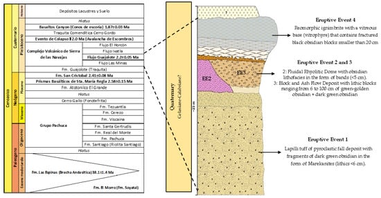 - Cruz-Pérez, M.A.; Canet, C.; Pastrana, A.; Domínguez-Peláez, S.; Morelos-Rodríguez, L.; Carcavilla, L.; Salgado-Martínez, E.; Krieger, P.; García-Alonso, R.J.; Martínez-Serrano, R.G. Green and Golden Obsidian of “Cerro de Las Navajas”, Hidalgo (Mexico): Geoarchaeological Heritage That Deserves International Recognition. Geoheritage 2021, 13, 92. [Google Scholar] [CrossRef]