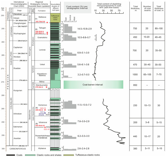 The Permian Period was a time of profound geological, climatic, and biotic transformations recorded in sedimentary basins worldwide [1,2,3]. Understanding the timing and nature of these processes requires accurate and regionally constrained stratigraphic frameworks [4,5,6]. In the Kuznetsk Coal Basin (Western Siberia), regarded as a reference region for the stratigraphy of the Siberian palaeocontinent, the regional stratigraphic scheme currently in use—developed over 40 years ago [7]—remains essentially unchanged [8], despite significant advances in geochronology [9]. In particular, the lack of reliable radioisotopic age constraints has limited the direct correlations with the International Chronostratigraphic Chart and has restricted the integration of regional sedimentological data and biotic events into the global record [10].