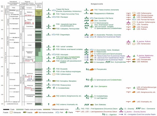 Direct biostratigraphic correlation with the SGCS is impeded by the absence of marine fossil groups—such as conodonts, fusulinids, and ammonoids—that serve as key global chronostratigraphic markers. At the same time, correlation with the Russian GSSR, whose middle and late Permian subdivisions are also primarily based on continental deposits [33], is complicated by the palaeogeographic and biogeographic isolation of the Kuznetsk Basin during the Late Palaeozoic. This isolation resulted in a high degree of endemism in its floral and faunal assemblages [34,35,36].