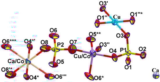 We deposited structural data via the joint CCDC/FIZ Karlsruhe deposition service as CSD 2428382, where it can be obtained free of charge. Characteristic distances are given in Table 3. The crystal chemical formula of the compound, which is consistent with the microanalysis data, was established as Ca2Cu2+(Co2+0.5Cu2+0.5)2M1(Ca0.6Co2+0.4)M2(PO4)4 for Z = 2. The simplified formula can be written as Ca2.62Cu1.94Co1.44(PO4)4. Bond-valence calculations were made using the algorithm and parameters from [,]; the outcome (Table 4) clearly confirms the 2+ valence state of Cu and Co. In addition, the results of the bond-valence sum data prove the mixed occupancy of the M1 (Cu/Co) and M2 (Ca/Co) positions. All figures displaying crystal structures were made using the Diamond program [].