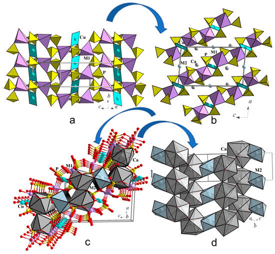 Two types of layers that are nearly parallel to the (101) plane can be distinguished in the structure. One of them is built by sharing corners with CuO4 squares, M1O5 square pyramids that are statistically occupied by Cu and Co atoms in almost equal amounts, and PO4 tetrahedra. Two distinct chains aligned in the [010] direction alternate within this layer; one is formed from CuO4 squares and P1O4 tetrahedra, whereas another double chain is built by M1O5 and P2O4 polyhedra (Figure 3a). The Ca2+ and Co2+ cations are located between the anionic layers of the [Cu2+(Cu2+0.5Co2+0.5)M12(PO4)4]6− composition, uniting them in a framework (Figure 3b). Each CaO9 polyhedron is linked via oxygen bridging contacts with two neighboring polyhedra to form double chains that run parallel to the b axis of the unit cell. The M2O6 octahedra bond these chains in the layers, as shown in Figure 3c,d.