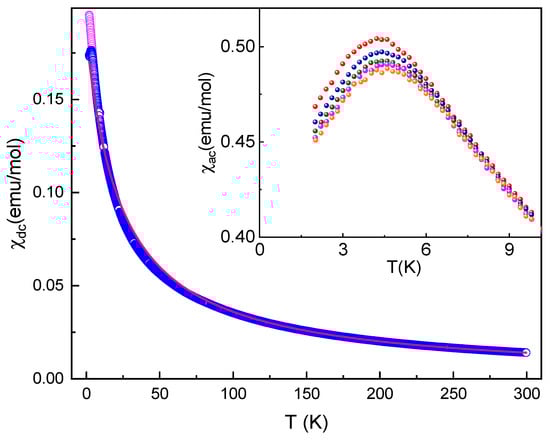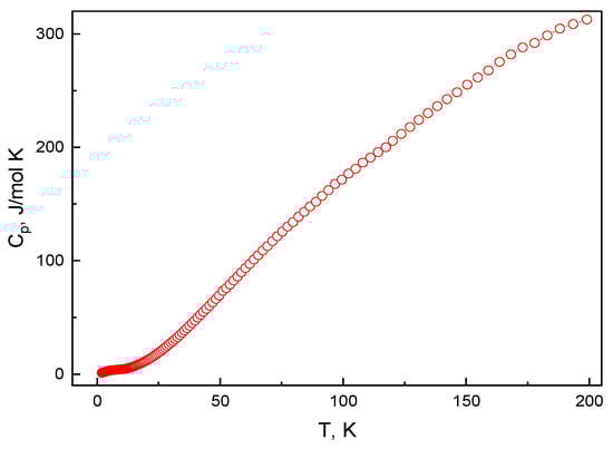 The thermodynamic properties of the title compound were studied using various options of “Quantum Design” PPMS-9T in the temperature range of 2–300 K in a magnetic field up to 9 T. Figure 6 shows the temperature dependence of the magnetic susceptibility χdc taken at 0.1 T in both the FC and ZFC regimes. These curves coincide over most of the temperature range, except for temperatures below 5 K. At lower temperatures, the ZFC curve exhibits a peak and deviates towards lower magnetization values compared to the magnetization measured in the FC mode. This difference reflects the smeared antiferromagnetic order in the system. At higher temperatures, the χ(T) curve follows the Curie–Weiss law, as follows: