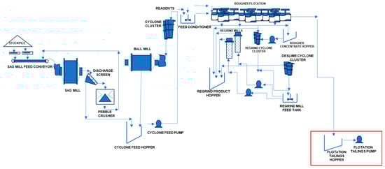 Froth flotation remains the primary beneficiation method for copper, but this is limited due to the constraints on floatable particle size coupled with limited liberation. These limitations often result in substantial copper losses from tailings, particularly with ultrafine (<20 µm) and coarse (>150 µm) size fractions. Other studies have shown that in many copper concentrators, over 50% of copper losses occur in the fine fraction, and 30%–40% occur in the coarse fraction [4,5,6]. Tailings are highly variable in their physical and chemical properties, influenced by the mining method, the ore type, and the processing technology, while their chemical makeup is determined by the ore mineralogical characteristics, the geological conditions, and the beneficiation processes [7]. In some operations, tailings can constitute up to 97%–99% of the total ore processed [8,9]. Advances in extraction technology, new market demands, and improved commodity prices can provide the impetus for the transformation of these wastes into valuable resources, enabling the recovery of metals and minerals once discarded. One major environmental concern is acid mine drainage (AMD), which occurs when sulphide-rich tailings are exposed to air and water, generating acidic solutions that mobilise toxic metals into surrounding water bodies [9,10]. Reprocessing sulphide-rich tailings can therefore serve both economic and environmental goals by recovering residual metals and reducing the long-term ecological impact. These residual minerals, often deposited due to having a low-grade content or using outdated extraction methods, contain trace elements like copper, lead, and zinc [10].