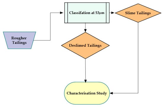 A 200 kg bulk flotation tailing sample was obtained from a flotation tailings hopper in an Australian copper processing plant (Figure 1). The sample was collected after the rougher flotation stage, which is designed to recover the bulk of copper from ore. To enable particle size specific assessments, the tailings were subjected to desliming to remove particles finer than 53 µm following the process outlined in Figure 2. The choice of a 53 µm particle size cut was dictated by the downstream processing routes explored in this study. The bulk sample was homogenised and divided into 1 kg subsamples for subsequent testing including characterisation (present study) and beneficiation (to be reported in a follow-up publication).