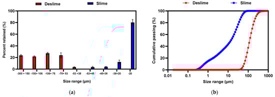 (a) Mass distribution in various particle size fractions and (b) cumulative particle size distribution curve by laser diffraction for deslimed and slime tailings.