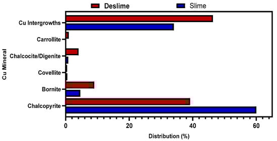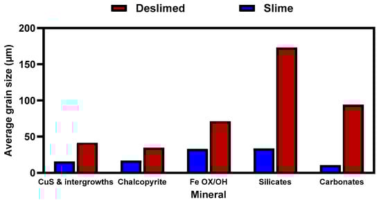 Figure 6 illustrates the average grain size of key minerals in both the slimes and the deslimed samples. The copper sulphides, along with their intergrowths, exhibit grain sizes in the range 40–170 µm in the deslimed tails and about 20 µm in the slimes. This observation aligns with an apparent relationship between mineral abundance and grain size distribution, where more abundant copper sulphides tend to display coarser grain size distributions (as can be seen in the mineral abundance for copper in the deslimed fraction in section in Table 6 and noted by [21]).