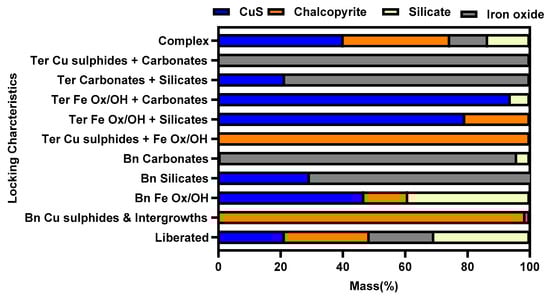 However, this effect may vary based on particle size and mineral association. In this study, QEMSCAN and SEM analyses (Section 3.5, Section 3.6, Section 3.7 and Section 3.8) show that copper sulphides in the coarse fraction are often intergrown with silicates and carbonates, whereas in the slimes, liberated chalcopyrite coexists with large amounts of hematite and goethite (Table 5 and Table 6, Figure 9).