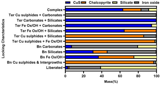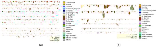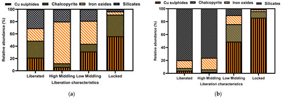 The degree of liberation of minerals was quantified by QEMSCAN, and this is shown in Figure 9. Mineral liberation has been grouped into four distinct classes based on the area percent of liberated minerals, including fully liberated (100%), high–middling (80%–90%), low–middling (30%–70%), and locked (0%–30%). In the slimes, over 60% of Cu sulphide is in the fully liberated category. In contrast, the deslimed sample (Figure 9b) shows a notable shift, with a larger proportion of Cu sulphides falling into the low–middling and locked categories. The lower degree of liberation suggests that they are more challenging to recover from gangue in beneficiation (e.g., flotation), as discussed further below.