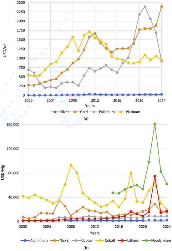 Historical price trends of (a) silver, gold, palladium, and platinum [10] and (b) nickel, copper, cobalt, lithium, aluminium [10,11], and neodymium [16] between 2000 and 2024.