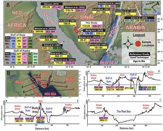 (A) Simplified topographic map for the ANS in the Egyptian Eastern Desert and Sinai with the previous thermochronological studies [9]. The inset in the upper right corner outlines the area of study location between the African, Eurasian, and Arabian plates. Abbreviations used include Ar–Ar for argon–argon dating, ZFT for zircon fission-track, ZHe for zircon (U-Th)/He, AFT for apatite fission-track, and AHe for apatite (U-Th)/He methods [5,6,7,8,9,10,11,12,28,30,31,32]. (B) Elevation-based topographical map representing the Red Sea/Suez/Aqaba rift systems, which includes the Egyptian portion of the ANS (E-ANS), with various topographic cross-sections corresponding to thermochronological data points shown in part A. Profile aa′ traverses the Northern Eastern Desert (NED), center of the Suez Rift, north of the South Sinai, center of the Aqaba Rift, and north of the Arabian region; here the basement is located at approximately 3 km depth [33]. Profile bb′ extends through the NED, south of the Suez Rift, south of the South Sinai, south of the Aqaba Rift, and north of Arabia, showing basement depths reaching around 4 km [33]. Profile cc′ runs across the Central Eastern Desert (CED), north of the Red Sea, and the center of Arabia (modified after [9]).