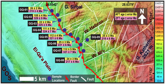In this research, samples were systematically collected from across the Wadi Hebran region, situated along the Suez Rift’s eastern flank, parallel to its shoreline (Figure 2). An approach includes ZFT and AFT dating, and t–T modeling was applied on nine representative samples of the ANS Neoproterozoic basement rocks (Table 1). The collected samples represent the root of the ANS outcrops (the most recent exhumed part), which encompasses the effect of the last tectonic event (i.e., the Suez rifting) [15,28].