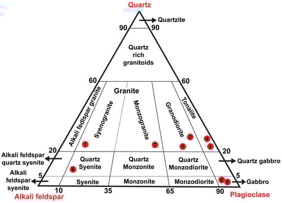 Modal data plot on the IUGS quartz–alkali feldspar–plagioclase diagram of the collected samples of the study area.