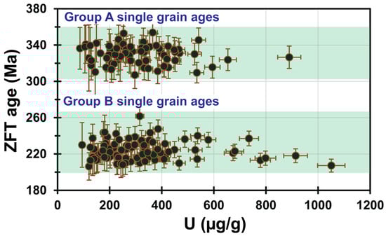 The ZFT cooling ages from the analyzed samples fall into two distinct age clusters, centered around 324 ± 7 Ma and 220 ± 5 Ma, respectively (Table 3). The potential influence of metamictization was not found, as no significant relationship was observed between uranium-238 concentrations and ZFT cooling ages (Figure 5). This lack of relationship indicates that neither the chemical composition of the treated zircons nor the damage to the crystal lattice from radiation had a discernible impact on the resulting cooling ages [79,84,101].