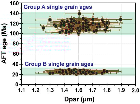 The resulting AFT ages can be classified into two distinct age clusters spanning around 112 ± 4 Ma and 22 ± 2 Ma (Table 4; Figure 2). This division reflects contrasting tectonic and thermal evolution pathways across the sampled region, which is driven by local movements of blocks through their bounding faults [6,9,10,12,16,32,35,37]. The lack of a consistent correlation between Dpar values and AFT ages (Figure 6) implies that variations in apatite chemistry had no significant influence on the derived cooling ages [79,81,98,103].