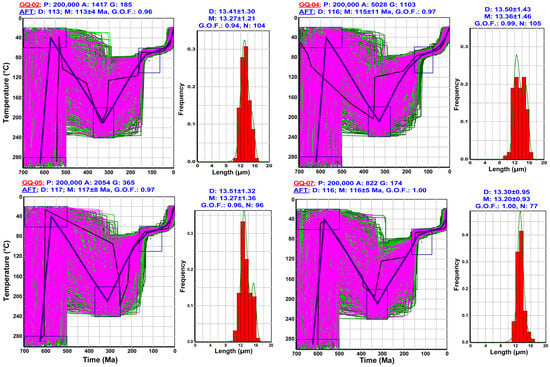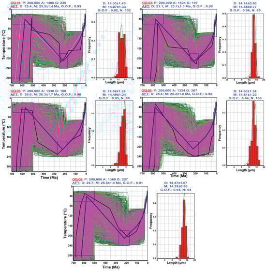 The reconstructed thermal history for the older AFT age group reveals distinct cooling episodes through the Neoproterozoic–Cambrian, Devonian–Carboniferous, Cretaceous, and Oligocene–Miocene periods. These models were generated using the HeFTy software v.2.1.7 [83], based on inverse modeling approaches. The resulting t–T paths are categorized by fit quality: Green paths indicate acceptable fits, purple paths denote good fits, the black path represents the best-fit model, and the blue path shows the weighted mean path [83,98]. Model output details include P—the total number of inverse modeling iterations; A—the count of acceptable fit paths; G—the number of good fit paths; D—modeled AFT pooled ages and confined track lengths with 1σ uncertainties; M—measured AFT pooled ages and HCTLs; G.O.F.—the goodness-of-fit metric; and N—the number of single-grain ages and track length measurements used in the model.