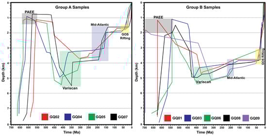 During the Cretaceous, the initiation of the Mid-Atlantic Ocean significantly influenced the area, leading to localized uplift events that mainly affected the blocks of group A samples, raising them to a depth of ca. 1.5–2 km. While blocks of group B samples experienced limited uplifts to reach a depth of ca. 3.8–4.8 km (Figure 9).