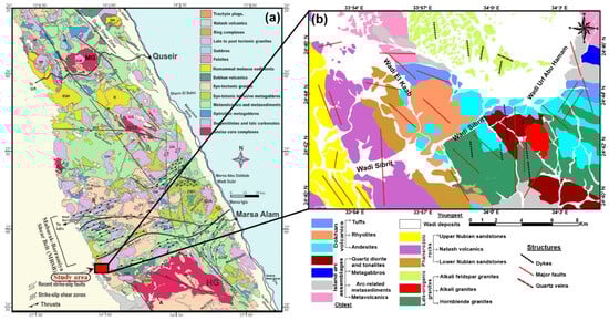 (a) Geological map of the southern part of the Southern Eastern Desert of Egypt showing the Neoproterozoic basement rocks (modified after [31]). (b) Geological map of the study district (modified after [32]).