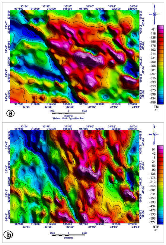 (a) Total intensity magnetic map of the study district. (b) The reduced-to-the-Northern magnetic pole (RTP) map of the study district. The Helmert 1906/Egypt Red Belt refers to a geodetic datum and coordinate system used in Egypt, based on the Helmert 1906 ellipsoid. Specifically, the “Red Belt” designation refers to a particular zone or area within Egypt, originally surveyed using second and third-order triangulations for cadastral applications.