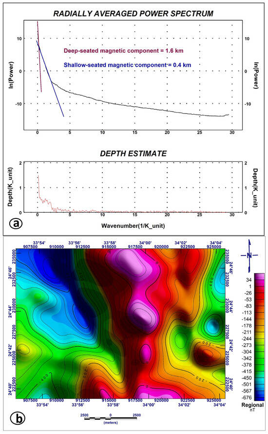(a) Radially averaged power spectrum and depth estimate of the RTP magnetic map of study district. (b) Low-pass (regional) filtered (frequency = 0.2–2.3 cycles/grid unit) of residual magnetic map of the study district.
