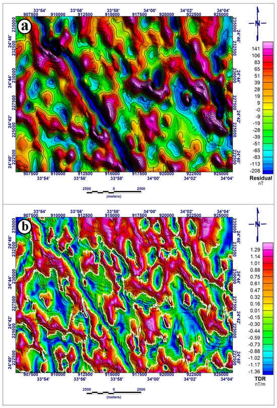 (a) High-pass (residual) filtered (frequency = 0.2–2.3 cycles/grid unit) of residual magnetic map of the study district. (b) Tilt derivative map of RTP magnetic data displaying the zero contour line of the study district.